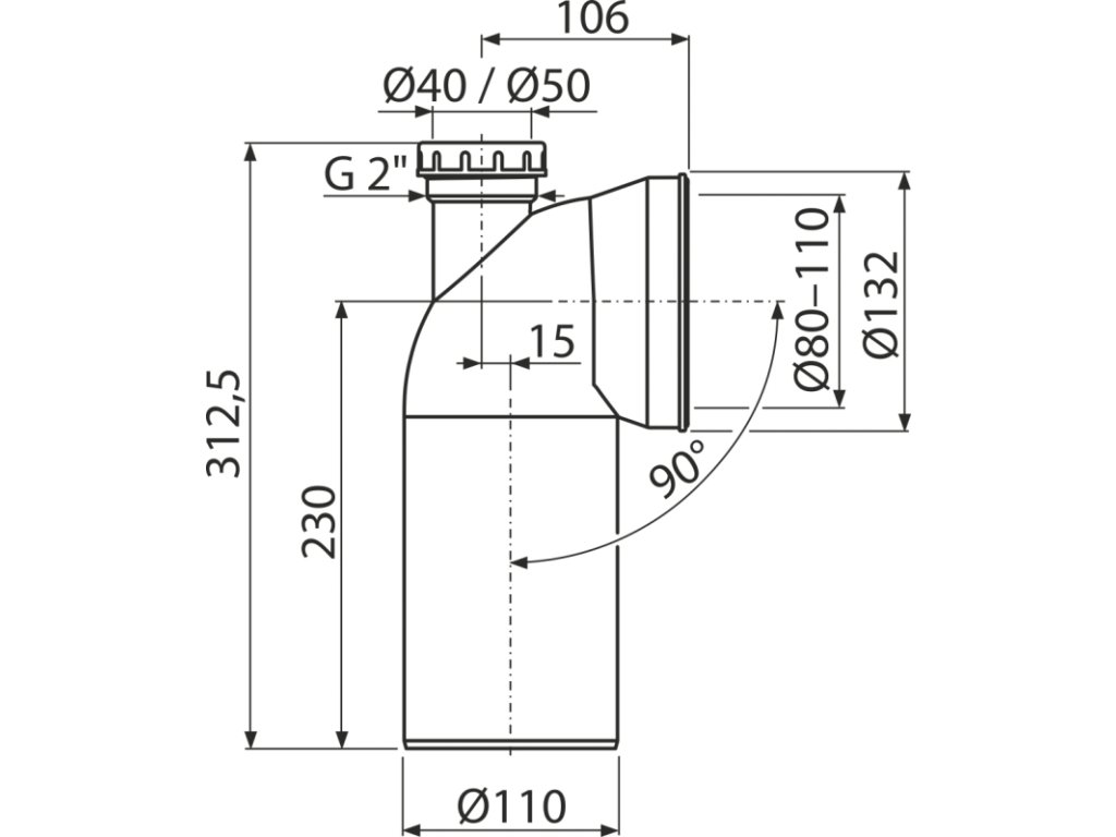 ALCA Dopojení k volně stojícímu WC, koleno 90°, s připojením DN 40/50, DN 110, délka 230 mm, PP, bílé A90-90P40/50A