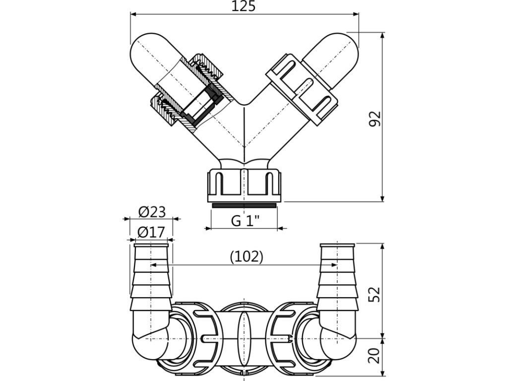 ALCA Dvojité kolínko G 1" × Ø 17–23 mm pro napojení pračky a myčky na sifon, se zpětnými klapkami P148Z