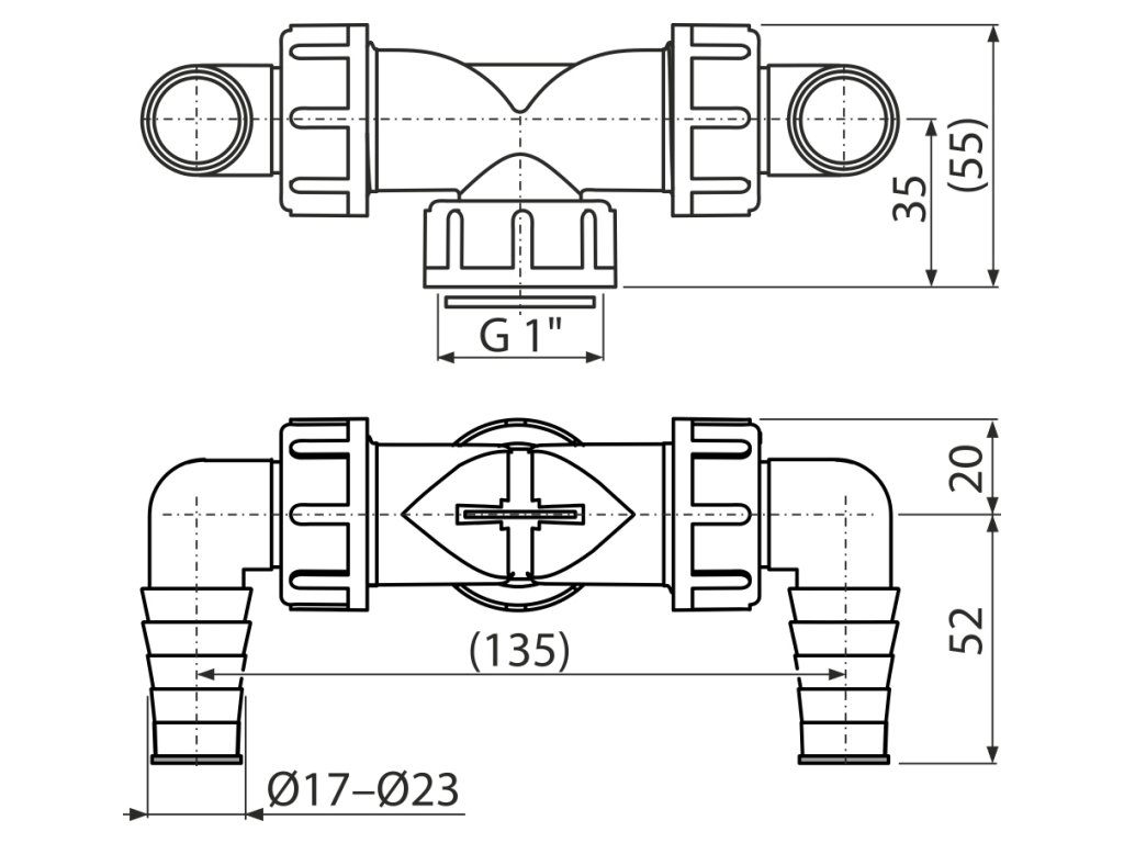 ALCA Dvojité kolínko G 1" × Ø 17–23 mm pro napojení pračky a myčky na sifon, se zpětnými klapkami P155Z-G1