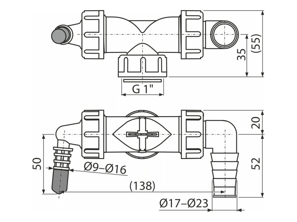 ALCA Dvojité kolínko G 1" × Ø 8–23 mm pro napojení pračky a sušičky na sifon, se zpětnými klapkami P156Z-G1