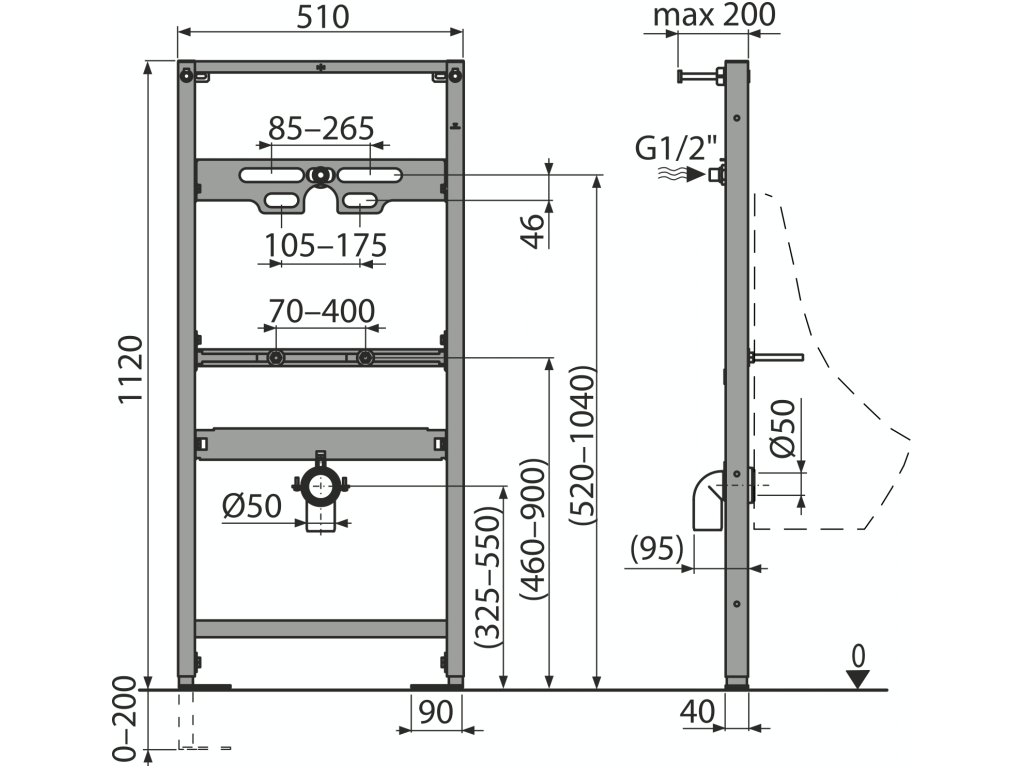 - Rozteč upevnění pisoáru 85–265 mm