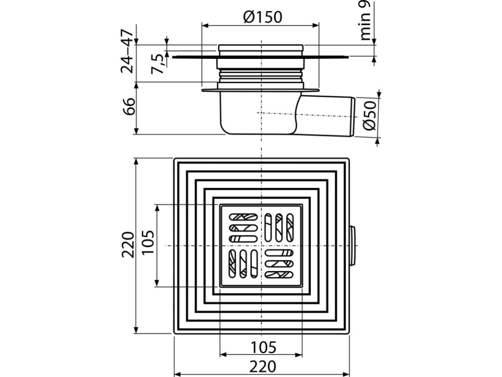 ALCA Podlahová vpust 105×105/50 mm boční, mřížka nerez, límec 2. úrovně izolace, suchá zápachová uzávěra APV26C