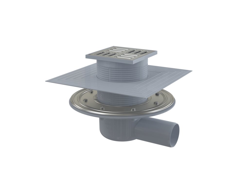 ALCA Podlahová vpust 105×105/50 mm boční, mřížka nerez, nerezová příruba a límec 2. úrovně izolace, kombinovaná zápachová uzávěra SMART APV1324