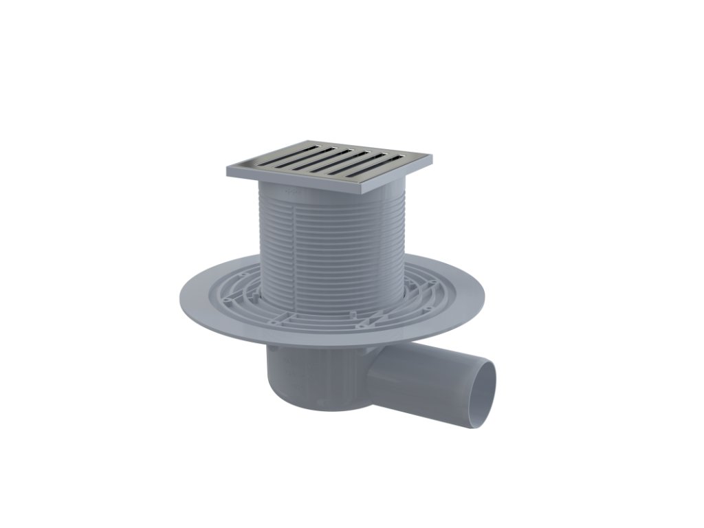 ALCA Podlahová vpust 105×105/50 mm boční, mřížka nerez, vodní zápachová uzávěra APV103
