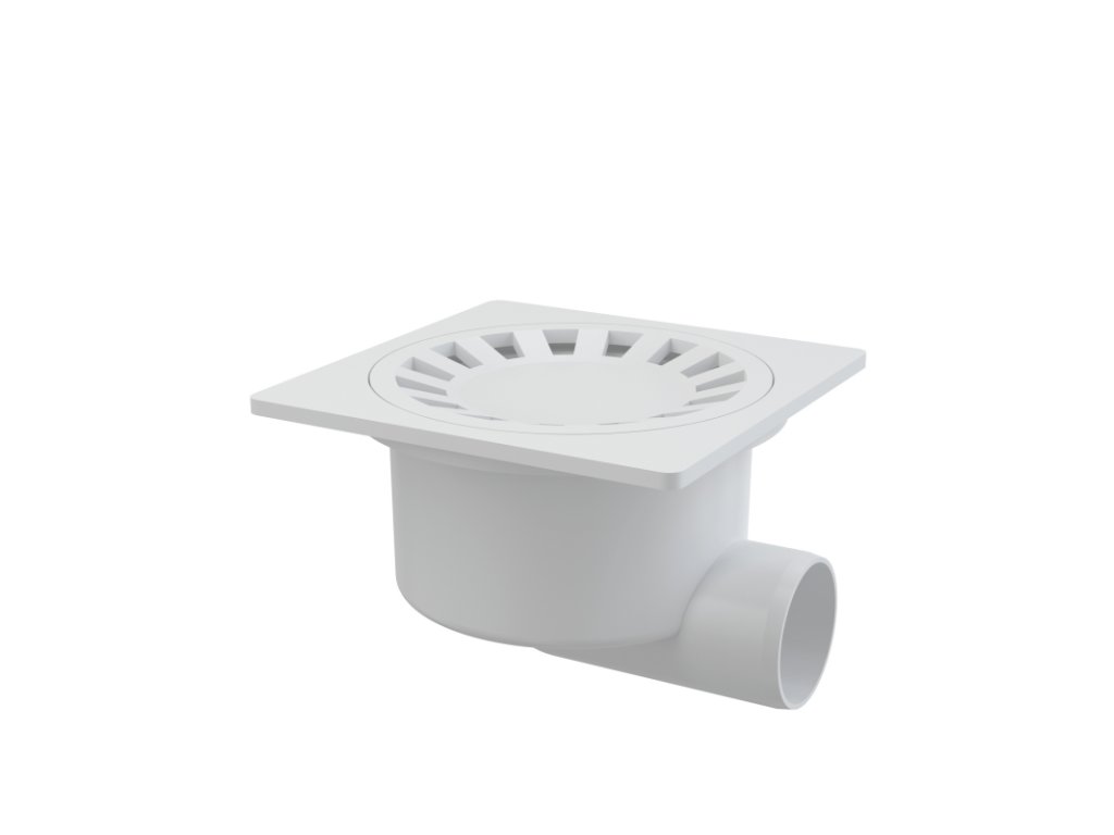 ALCA Podlahová vpust 150×150/50 mm boční, mřížka bílá, vodní zápachová uzávěra APV15