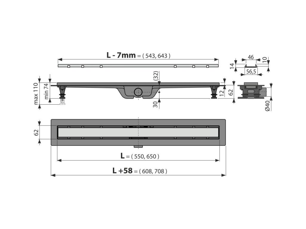 ALCA Podlahový žlab s okrajem pro oboustranný rošt APZ19-550