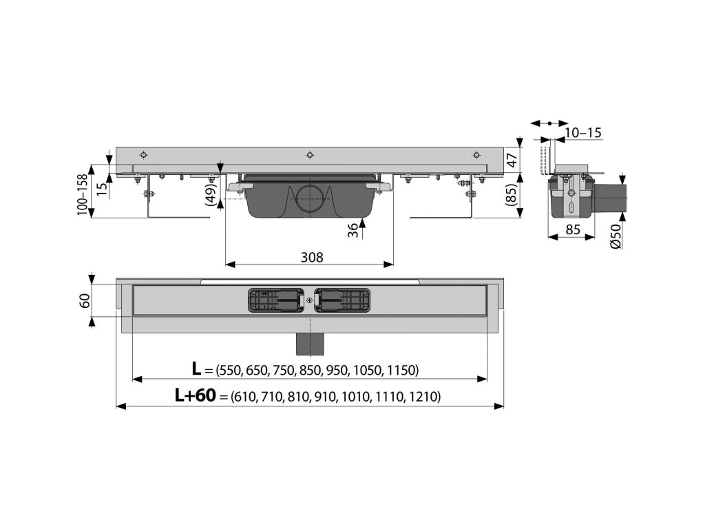 ALCA Podlahový žlab s okrajem pro perforovaný rošt a s nastavitelným límcem ke stěně APZ4-750