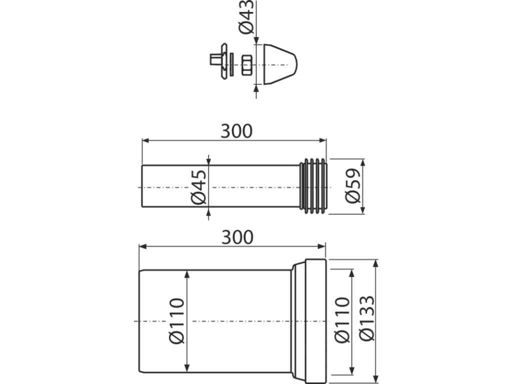 - Přímé hrdlo pro napojení závěsné WC mísy k odpadu, polyethylen, Ø110 mm, včetně manžety
