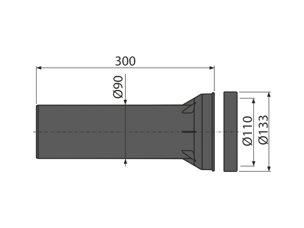 - Přímé hrdlo pro napojení závěsné WC mísy k odpadu, polypropylen, Ø90 mm, včetně těsnění