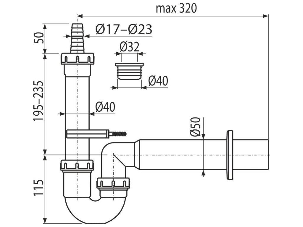 ALCA Sifon trubkový pro pračku nebo myčku, s nátrubkem Ø 17–23 mm, DN 50 APS7-DN50