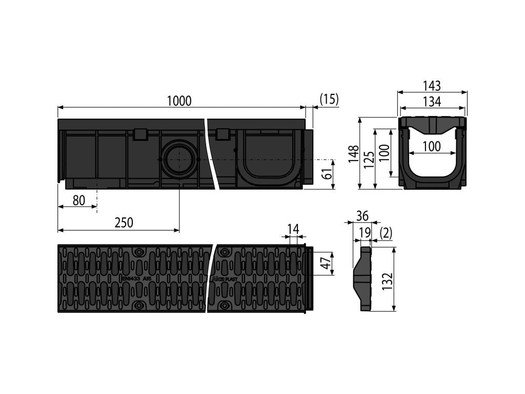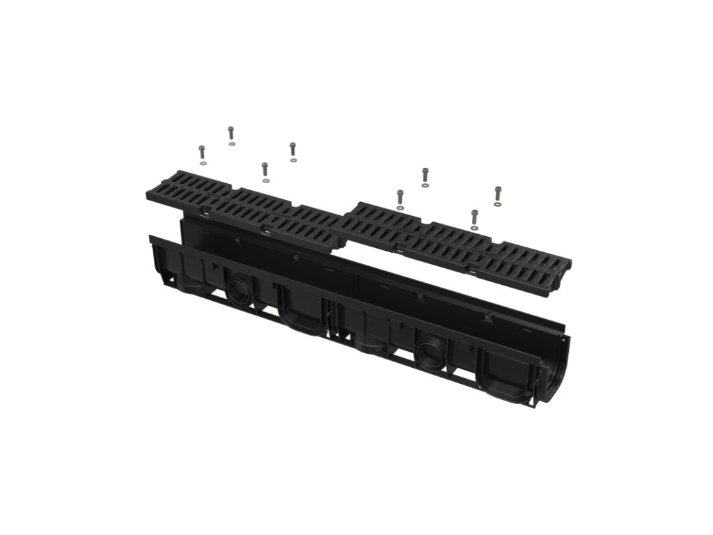 - Rošt plastový – fixovaný ve žlabu pomocí osmi kusů nerezových šroubů, šířka vtokové štěrbiny 14 mm