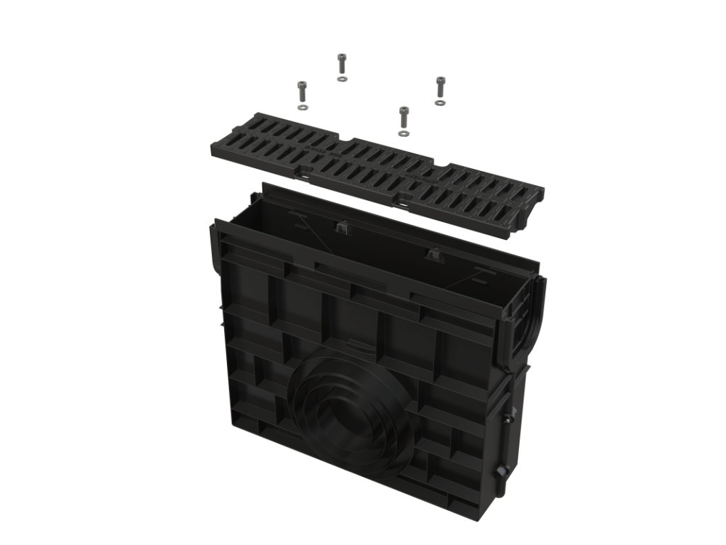 - Rošt kompozitní – fixovaný ve žlabu pomocí čtyř kusů nerezových šroubů, šířka vtokové štěrbiny 14 mm