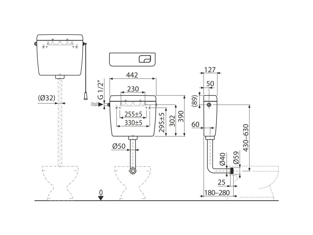 - Splachovací set pro vysoko položenou nádržku (šňůrka, držátko, páka)