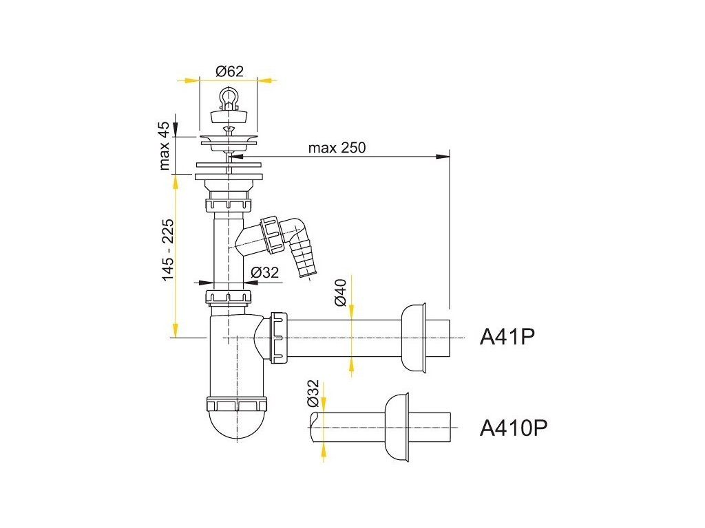 ALCAPLAST sifon umyvadlový O40 s přípojkou a nerezovou mřížkou O63, A41P