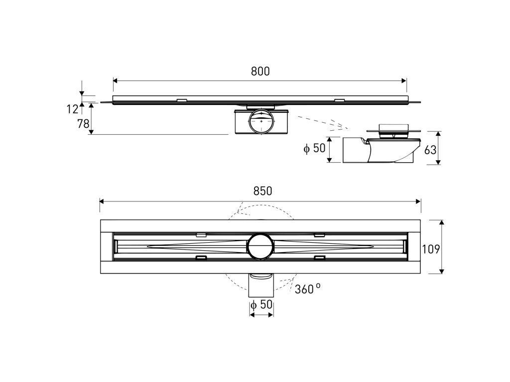 - otočný odtok - rychlý, otočný odtok se standardním 50mm odtokem pro instalaci v libovolné vodorovné poloze, na rozdíl od žlabů s pevným neotočným sifonem