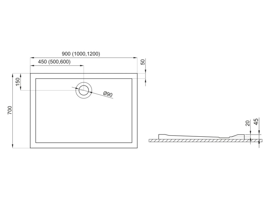 Tabulka velikostí sprchové vaničky Lider