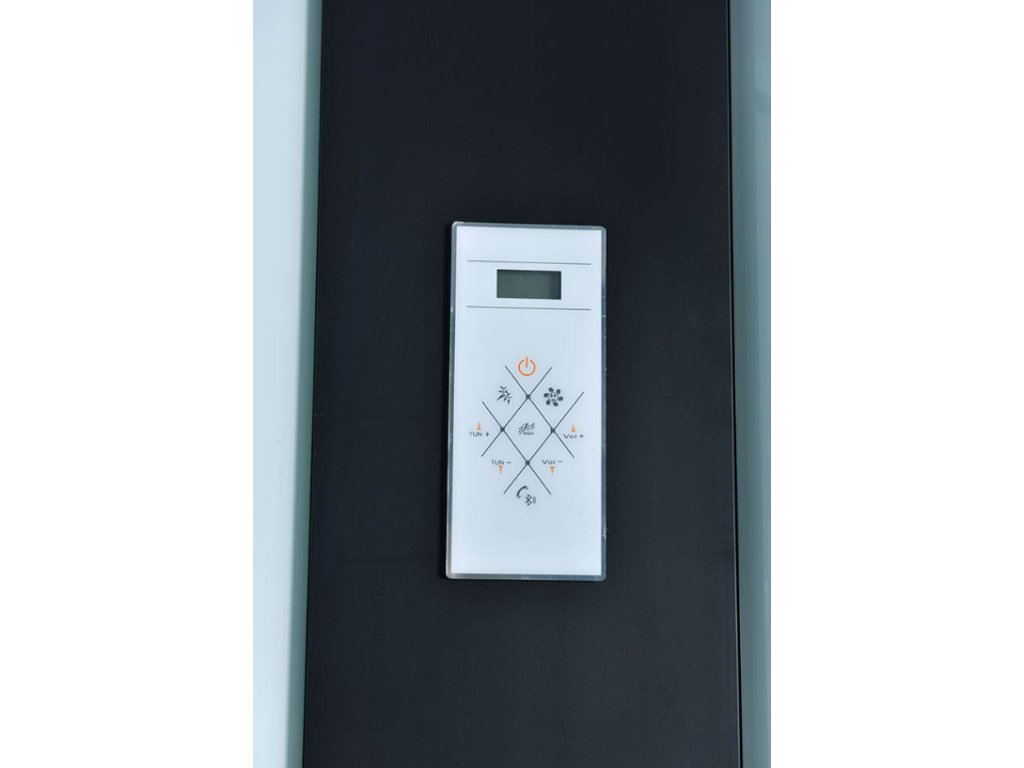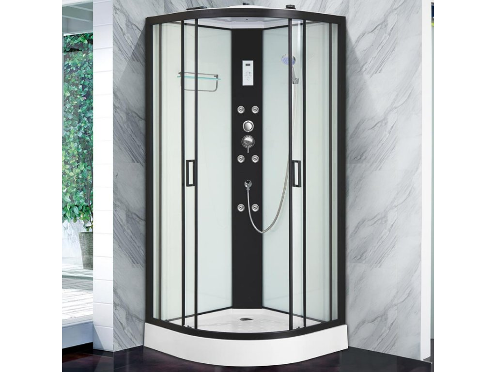 - moderní světlé provedení čtvrtkruhového masážního sprchového boxu s černými profily
