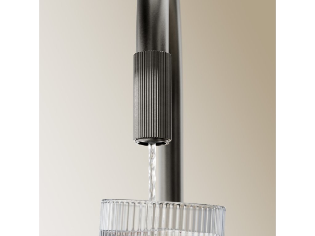 Dřezová baterie SWITCH kombinuje minimalistický design, který vychází z vyvážených proporcí, s praktickou funkčností, která zajišťuje pravidelný přísun a filtraci vody. Jasně definované a precizně zpracované detaily umožňují intuitivní používání tím, že ukazují na dva oddělené proudy vody: běžnou vodu v blízkosti páky a filtrovanou vodu na konci výtoku - stačí otočit žebrovaným výtokovým kroužkem a rychle naplnit sklenici lahodnou čerstvou pitnou vodou.