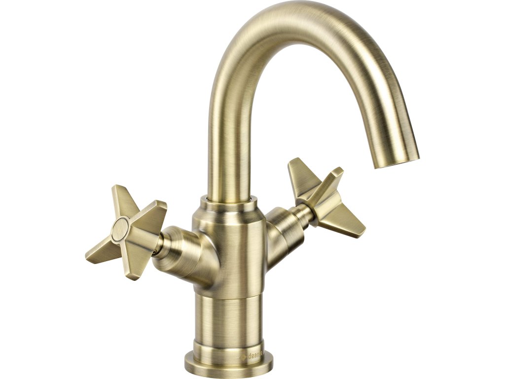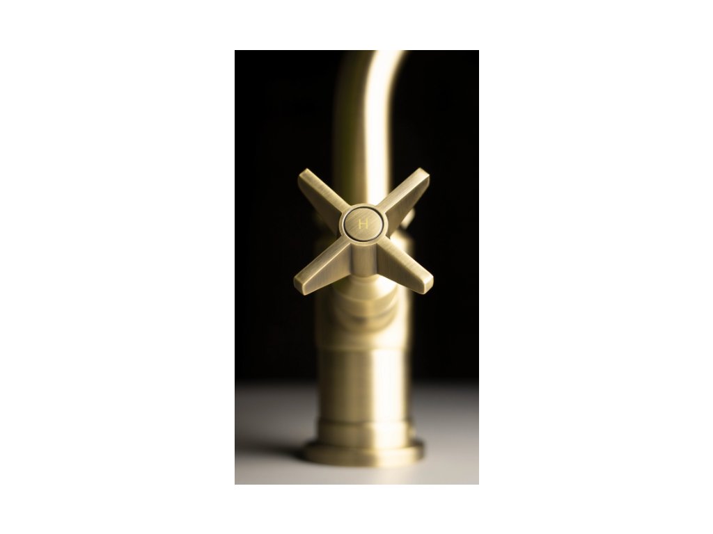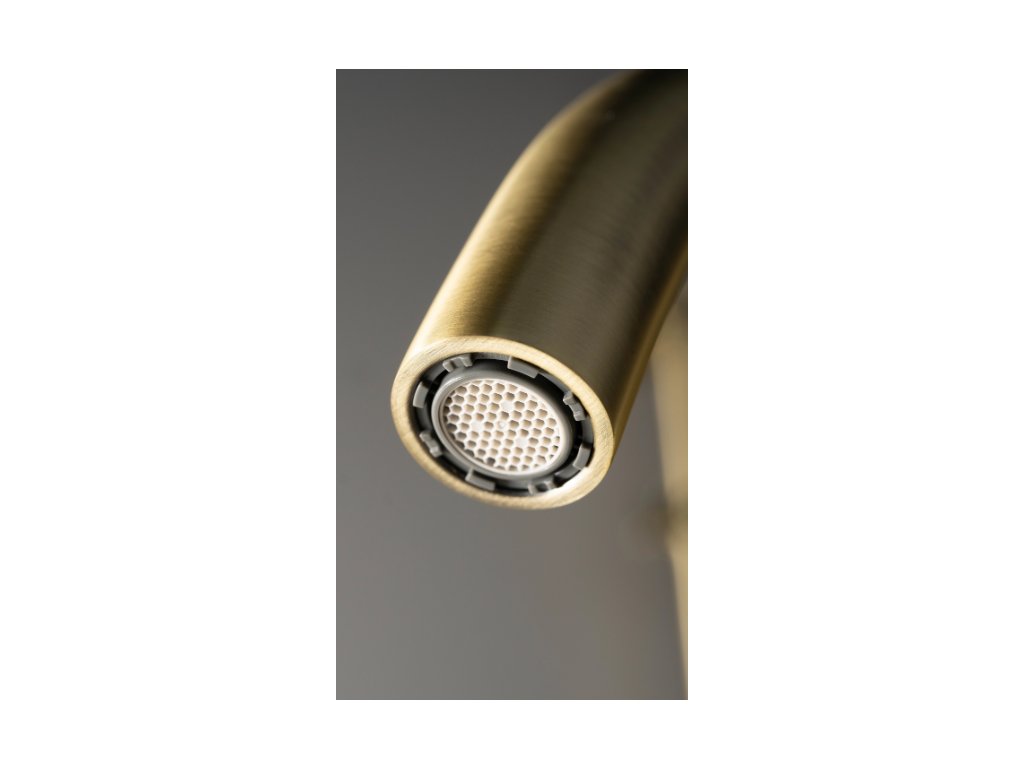 Stojánková mosazná umyvadlová baterie ze série Temisto je stejně jako ostatní výrobky této jedinečné kolekce příkladem dokonalé kombinace stylu, moderní technologie a designu. Krásné, nadčasové tvary této dvouručkové volně stojící umyvadlové baterie na jedné straně připomínají interiéry z minulosti a na straně druhé se dokonale hodí do koupelen zařízených v moderním stylu. Tato umyvadlová baterie s krásně zaoblenou, vysokou výtokovou trubicí a stylizovanými knoflíky na teplou a studenou vodu je navíc vybavena pohyblivým perlátorem, který umožňuje nasměrovat vodu požadovaným směrem. Perlátor provzdušňuje kapky a zvyšuje objemnost proudu, čímž snižuje spotřebu vody. Přiložená zátka clic-clac s přepadem umožňuje snadné uzavírání a otevírání odtoku a keramická hlavice s úhlem natočení 90° umožňuje rychlé nastavení požadované teploty vody. Zde vyobrazená stojánková umyvadlová baterie má luxusní mosaznou povrchovou úpravu, která nejen odkazuje na retro styl kolekce, ale díky inovativní technologii povrchové úpravy je také mimořádně odolná. Kolekce Temisto je dokonalým příkladem retro designu v moderním pojetí a důkazem jsou četná ocenění, jako je například cena Must Have 2020, "Koupelna". - roku 2020 nebo Top Design 2020.