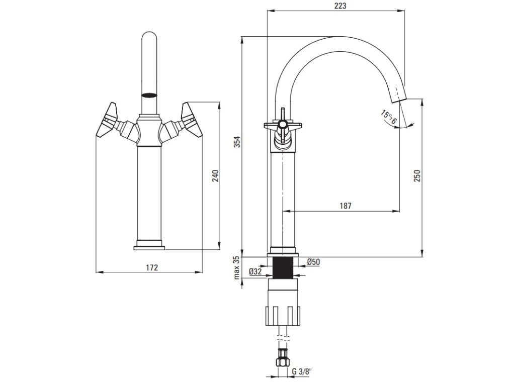 Temisto je moderní vodovodní baterie s nádechem retro stylu. Hodí se tedy do moderní, ale i retro koupelny a dá se skvěle kombinovat se spoustu jinými retro doplňky. Zdobí ji především dvě otočné páčky, s retro zdobením, na teplou a studenou vodu. Označení "H" je pro vodu teplou a "C" pro vodu studenou.