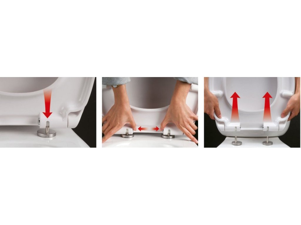 Snadné sejmutí a upevnění sedátka: stisknutím tlačítka (u některých modelů pouhým uvedením sedátka do kolmé polohy a vytažením) lze sedátko sejmout z pantů (podle typu obr. 1a, 1b, 1c) a následně pouhým zacvaknutím sedátko opět nasadit (obr. 2).