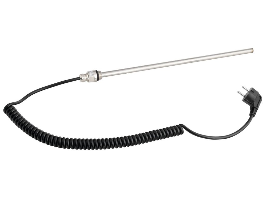 Elektrická topná tyč pro přímé zapojení do zásuvky elektrické sítě 230 V. Vhodná pro ohřev koupelnových radiátorů, které nejsou zapojeny do systému ústředního vytápění nebo mají kombinované připojení ústředního a elektrického vytápění, umožňuje zahřátí radiátoru i mimo topnou sezónu.
