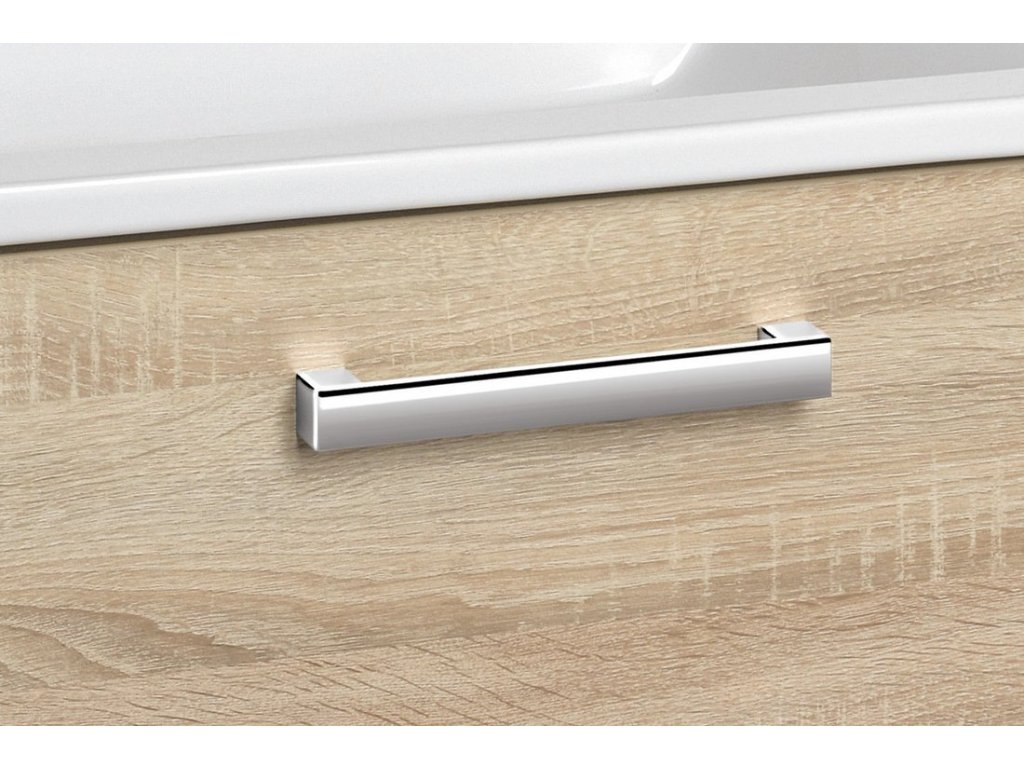 - Skříňka je dodávána s elegantními hranatými úchytkami v chromovém provedení.