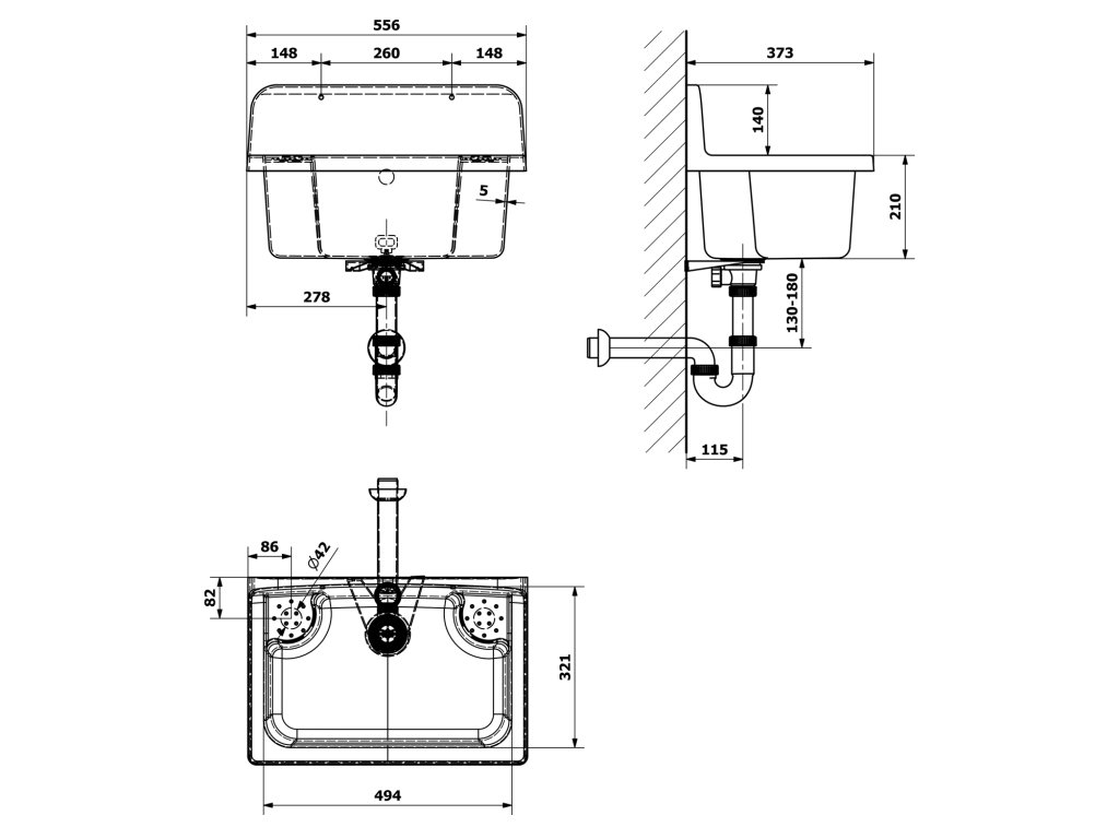- V odkladové ploše výlevky je příprava na otvor pro baterii, což umožňuje použití stojánkové dřezové baterie. Umístění předpřipraveného otvoru je označené na technickém výkrese.