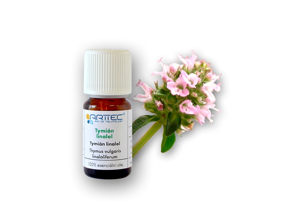 Esenciální olej Tymián linalol je extrahován divoce rostoucího druhu tymiánu obsahujícího celou řadu účinných látek, který je původní bylinou západního Středomoří a jižní Evropy. Tymián je jednou z nejstarších užitkových rostlin, pěstovali ho již v Sumeru (3.000 př.n.l.), jeho vlastnosti byly známy ve starém Egyptě, kde byla silice používána do balzamovacích přípravků, antičtí Řekové a Římané ho, mimo jiné používali jako koření. To je také v současnosti jeho z hlavních použití, kde zastupuje také konzervační a proti plísňovou složku. Není potřeba zdůrazňovat jeho úlohu v cukrářské výrobě, likérnictví, v kosmetice, při výrobě toaletních potřeb, mýdla, čistících prostředků a v neposlední řadě i repelentů proti hmyzu. Působení silice je jemnější a srovnatelné s ostatními druhy silic získávaných z ostatních druhů tymiánu. Z tohoto důvodu má tato silice široké pole použití a její aplikace je vhodná i pro děti.