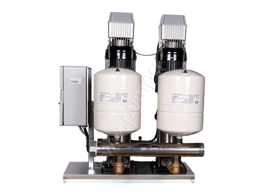 - 2 paralelně zapojená vertikální nerezová odstředivá čerpadla osazena na společné základové frémě
