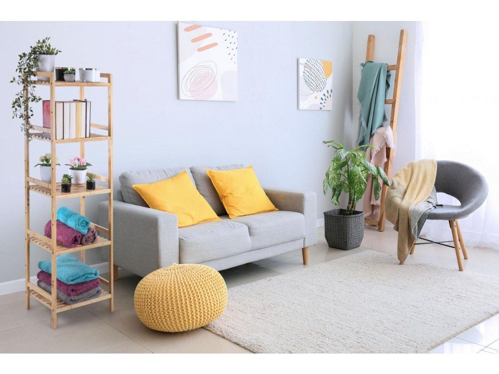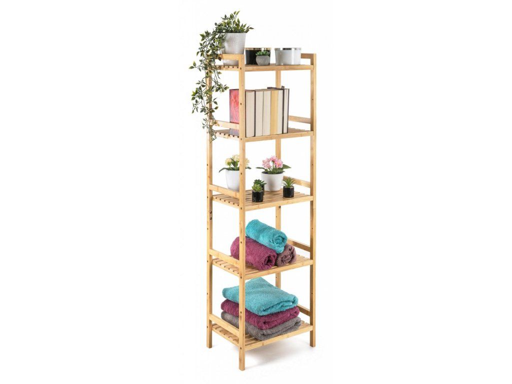 Bambusový regál s pěti policemi dodává interiéru příjemný přírodní dojem, pocit lehkosti a přirozenosti, zatímco jeho pevnost a dlouhá životnost zajišťují stabilitu a trvanlivost.