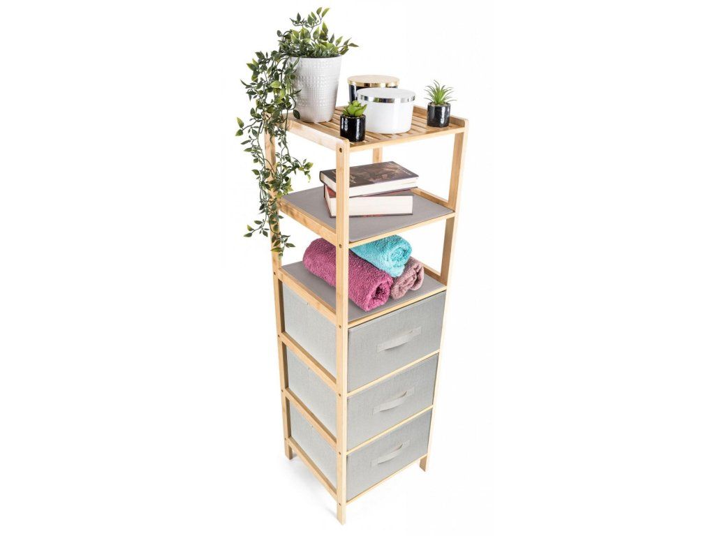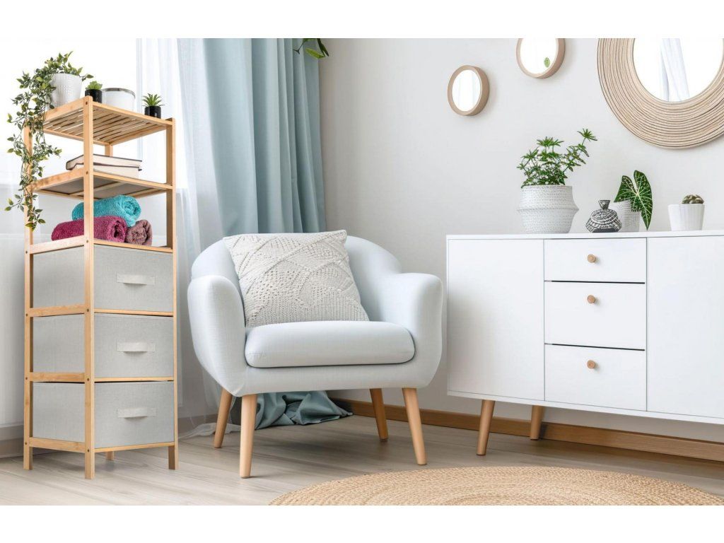 Bambusový regál s výsuvnými látkovými zásuvkami dodává interiéru příjemný přírodní dojem, pocit lehkosti a přirozenosti, zatímco jeho pevnost a dlouhá životnost zajišťují stabilitu a trvanlivost.