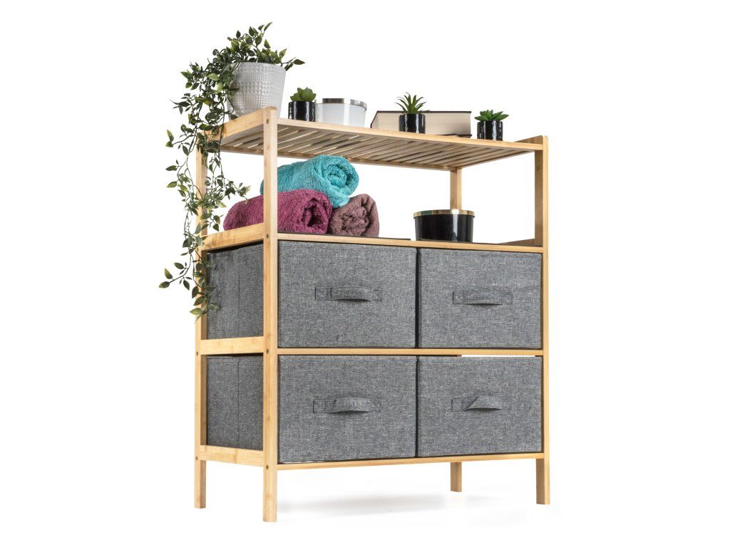 Bambusový regál s výsuvnými látkovými zásuvkami dodává interiéru příjemný přírodní dojem, pocit lehkosti a přirozenosti, zatímco jeho pevnost a dlouhá životnost zajišťují stabilitu a trvanlivost.
