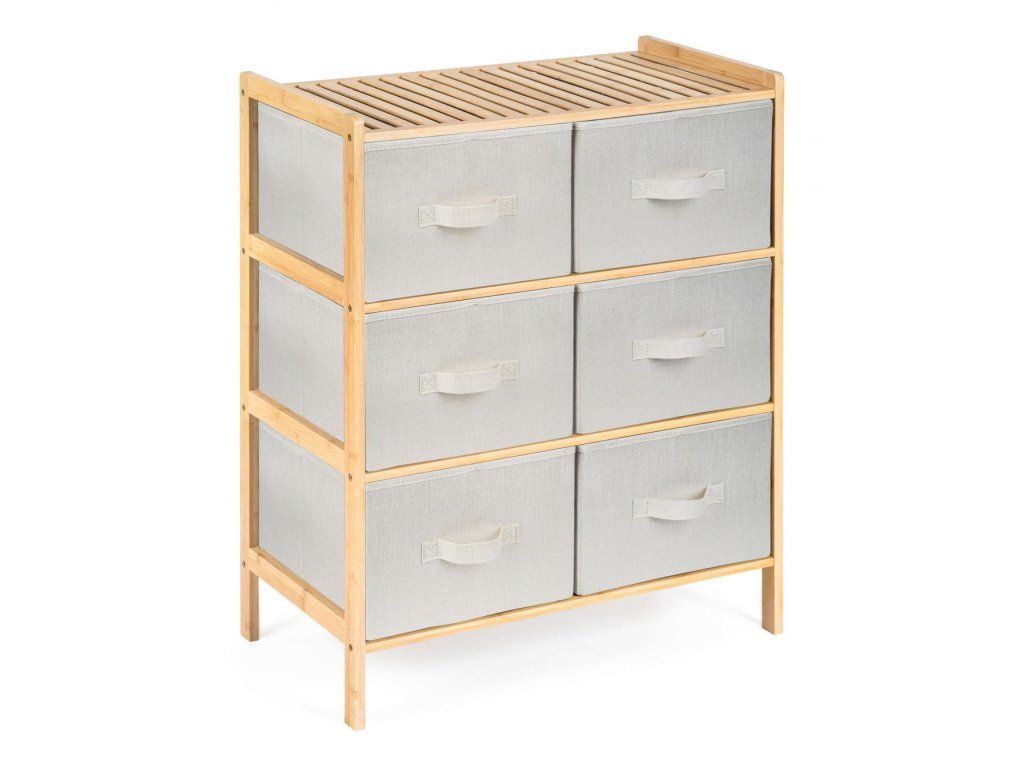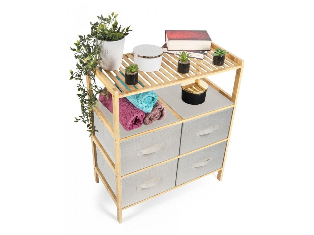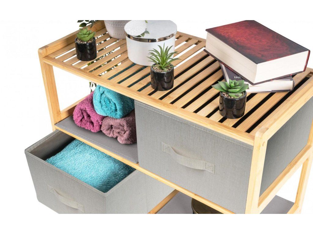 Bambusový regál s výsuvnými látkovými zásuvkami dodává interiéru příjemný přírodní dojem, pocit lehkosti a přirozenosti, zatímco jeho pevnost a dlouhá životnost zajišťují stabilitu a trvanlivost.