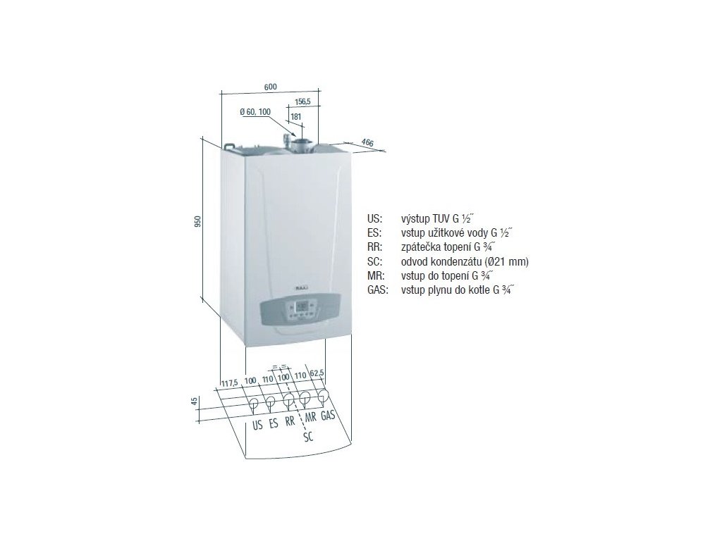 Kondenzační kotle s vestavěným nerezovým zásobníkem (40 litrů) s rozměry: výška 950 x šířka 600 x hloubka 466 mm.
