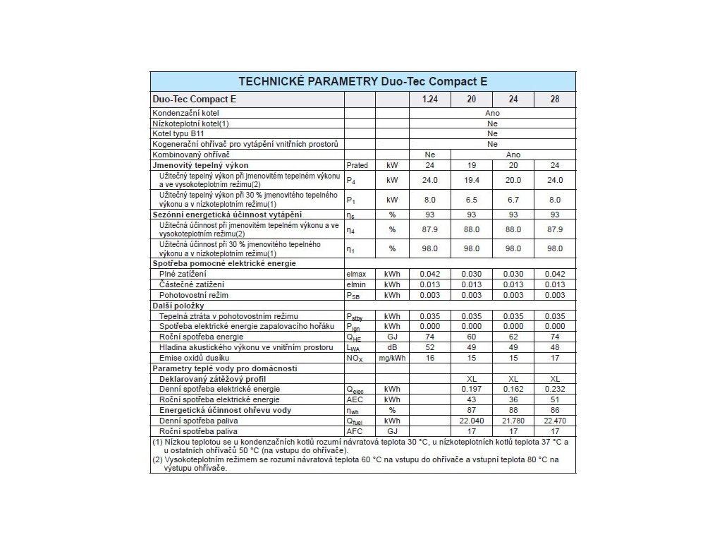 | Kotel | DUO-TEC COMPACT E 20 | DUO-TEC COMPACT E 24 | DUO-TEC COMPACT E 28 | DUO-TEC COMPACT E 1.24 |