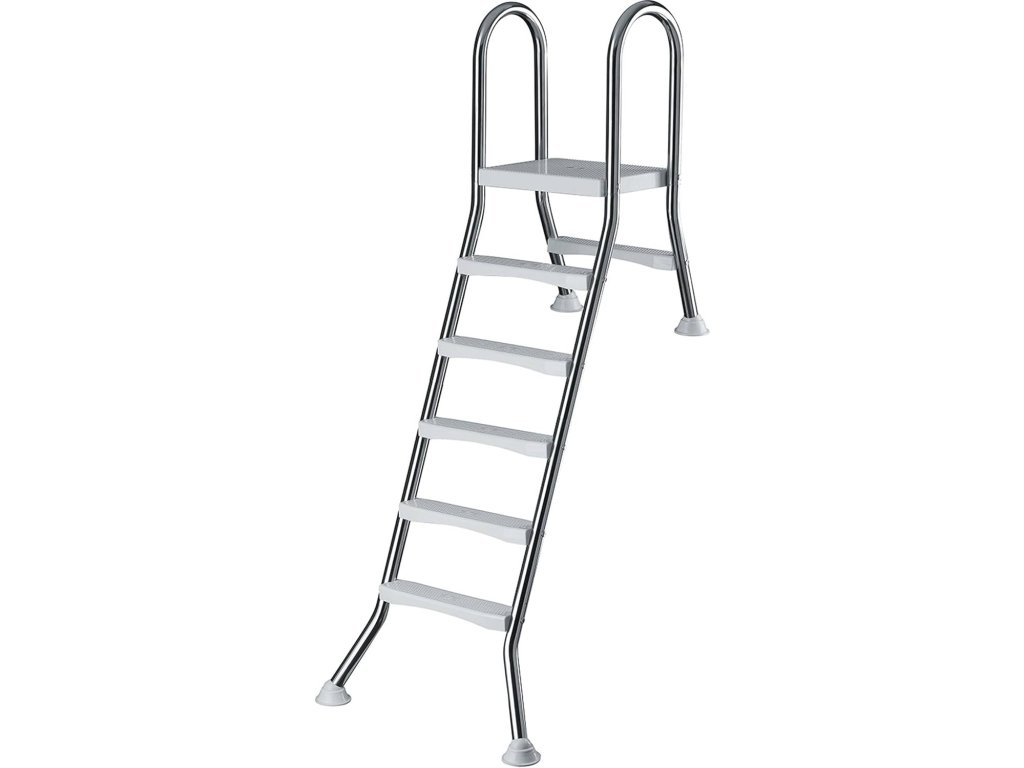Bazénové schůdky NEOVA 150 cm - nerezová ocel Naše bazénové schůdky NEOVA 150 cm jsou ideální volbou pro částečně zapuštěné bazény s hloubkou vody 150 cm. Tyto schůdky jsou vyrobeny z kvalitní nerezové oceli AISI304 a zaručují dlouhou životnost a odolnost proti korozi. Díky protiskluzovým schodnicím a pevným nohám jsou schůdky bezpečné a stabilní i při vyšším zatížení. Hlavní vlastnosti:Materiál: Vysoce kvalitní nerezová ocel AISI304 pro maximální odolnost vůči korozi. Protiskluzové schodnice: Schůdky jsou vybaveny protiskluzovými schodnicemi, které zajišťují bezpečný vstup i výstup z bazénu. Stabilita: Schůdky mají 1 schod na vnější straně a 5 schodů na vnitřní straně bazénu, což usnadňuje pohodlný a bezpečný přístup. Kapacita: Schůdky jsou navrženy pro nosnost až 150 kg, což je zajištěno stabilní konstrukcí a pevným plastovým stupněm. Vhodné pro částečně zapuštěné bazény: Schůdky jsou ideální pro bazény s hloubkou vody 150 cm.Technické parametry:Materiál: Nerezová ocel AISI304 Počet schodů: 5 schodů na vnitřní straně a 1 schod na vnější straně bazénu Protiskluzové schodnice Maximální nosnost: 150 kg Vhodné pro bazény s hloubkou vody 150 cmStabilní podložky z gumy na nožkách, které chrání bazénovou fólii před poškozenímPoznámka: Schůdky NEOVA 150 cm jsou určeny pro sladkou vodu. Při použití ve slané vodě nebo u bazénů s elektrolytickým solným systémem je možné, že dojde k degradaci materiálu v důsledku chloridové koroze nebo rezivění.Doplňkové parametry