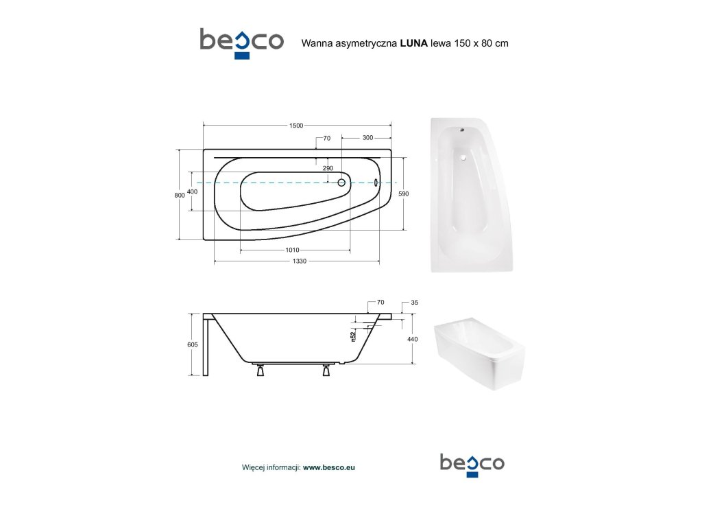 BESCO Asymetrická vana LUNA Nožičky k vaně - S nožičkami, Rozměr vany - 150 × 80 cm, Způsob provedení - Levé VANLUN150L+OLVPINOZ