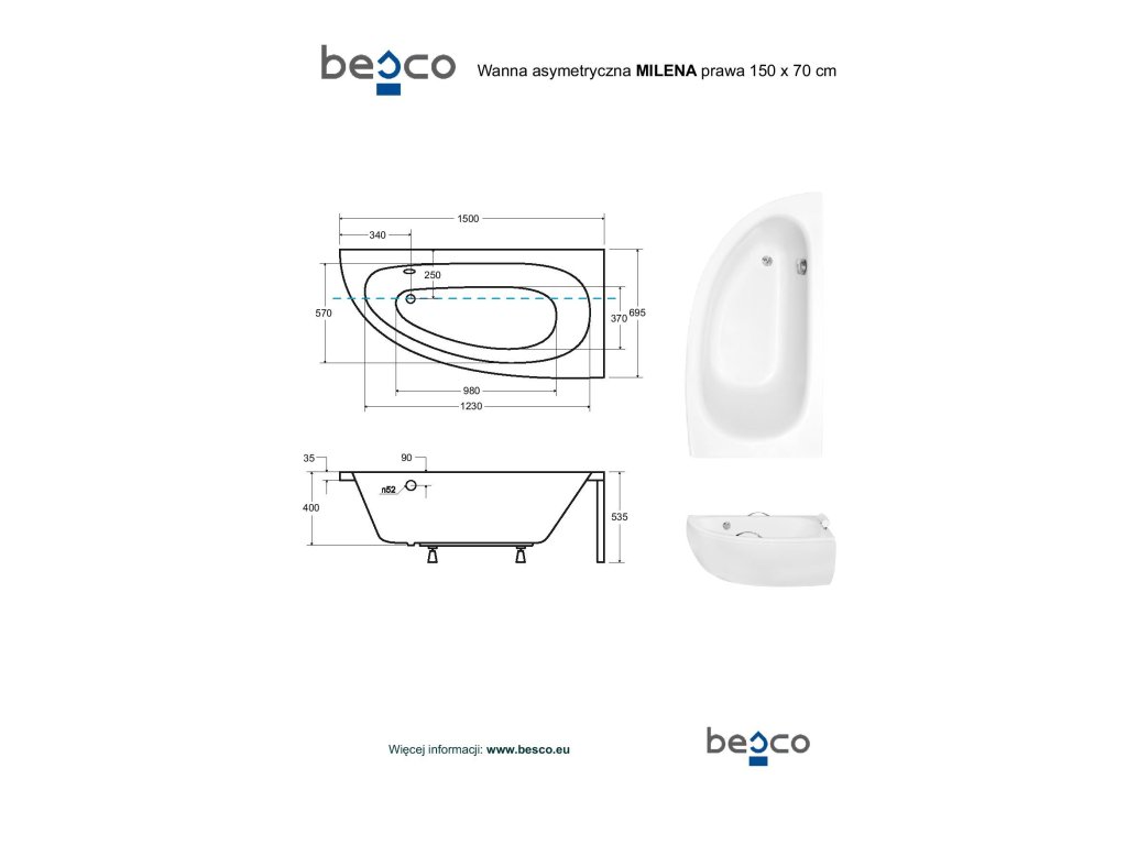 BESCO Asymetrická vana MILENA Nožičky k vaně - S nožičkami, Rozměr vany - 150 × 70 cm, Způsob provedení - Pravé VANMIL150P+OLVPINOZ