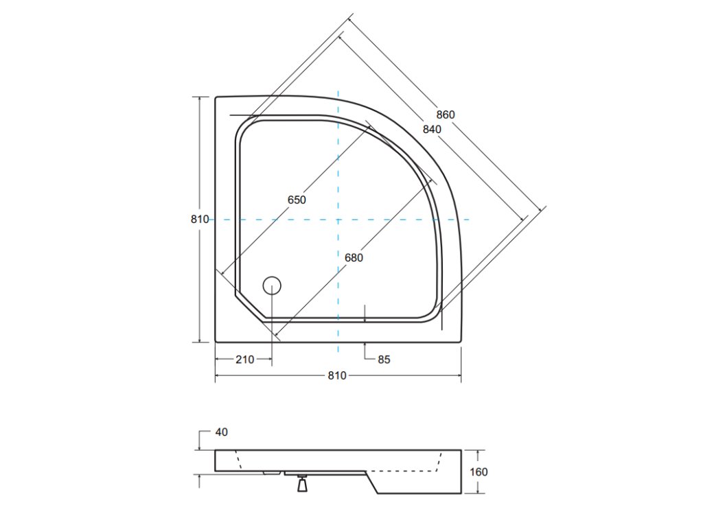 - čtvrtkruh 810 × 810 × 160 mm, R550