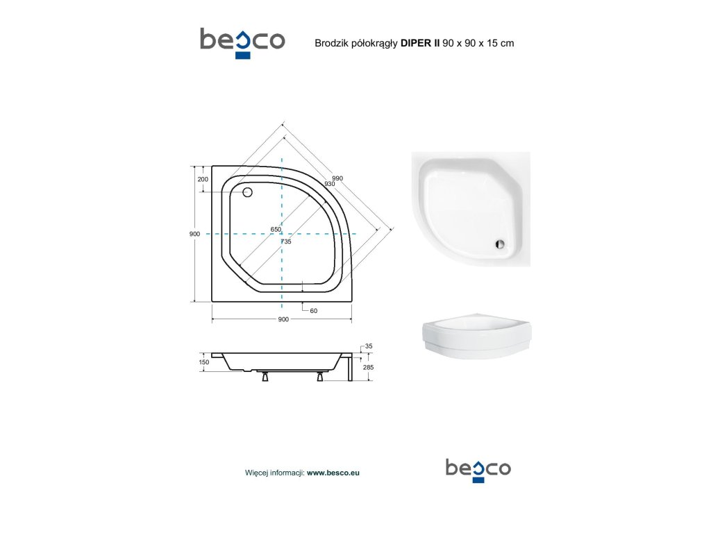 BESCO Čtvrtkruhová sprchová vanička DIPER II Nožičky k vaně - S nožičkami, Rozměr A - 90, Rozměr B - 90 VANKDIPERII90