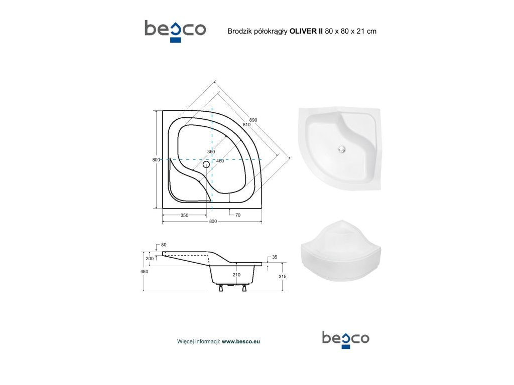 Sprchová vanička OLIVER II je určena ke čtvrtkruhovým zástěnám 80x80 a 90x90 cm a s rádiusem R550, Sprchovou vaničku je možné osadit s akrylátovým čelním panelem, nebo je ji možné obezdít.