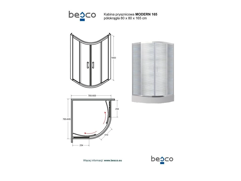 Čtvrtkruhový sprchový kout MODERN 165 (bez vaničky) vyniká vysoce kvalitním zpracováním a spolehlivou funkčností všech součástí a materiálů. Zástěna s výškou 165 cm je určena pro vaničky DIPER I a DIPER II.