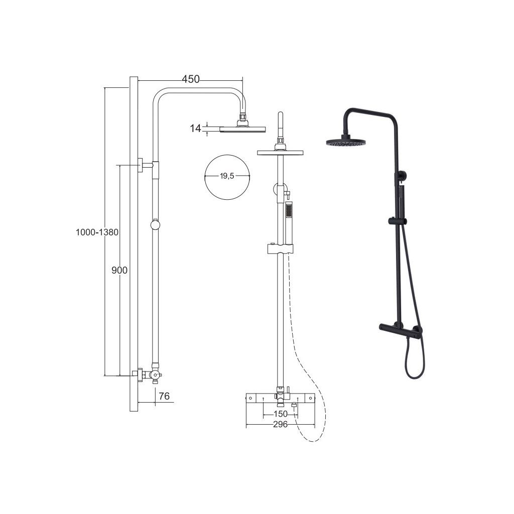 Rozsah nastavení hlavové sprchy od 1000 do 1380 mm.