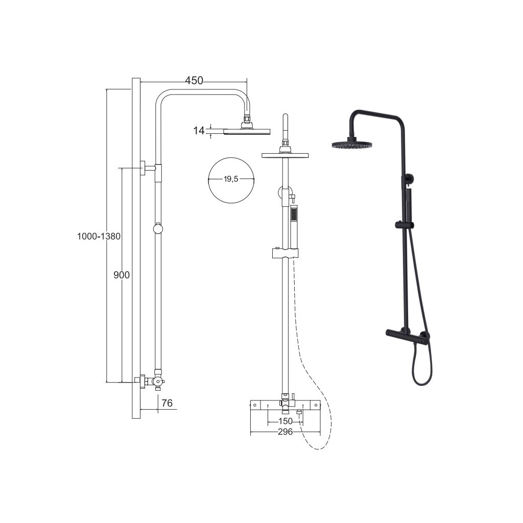Rozsah nastavení hlavové sprchy od 1000 do 1380 mm.