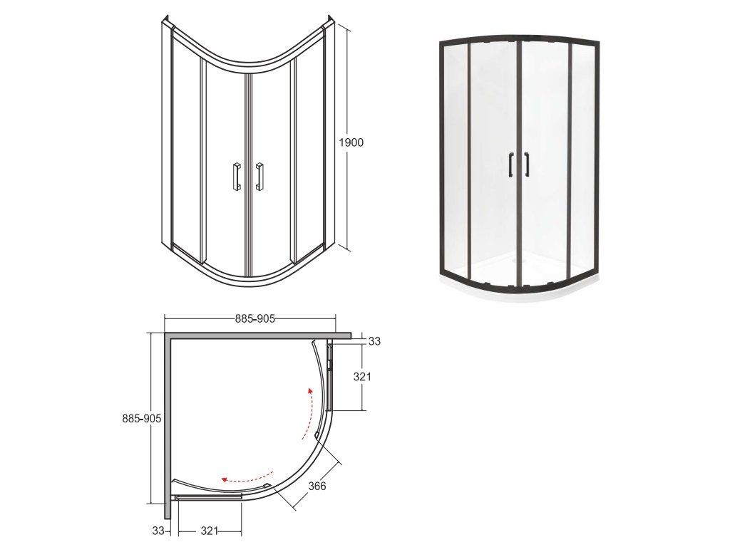 - designový čtvrtkruhový sprchový kout bez vaničky s černými profily