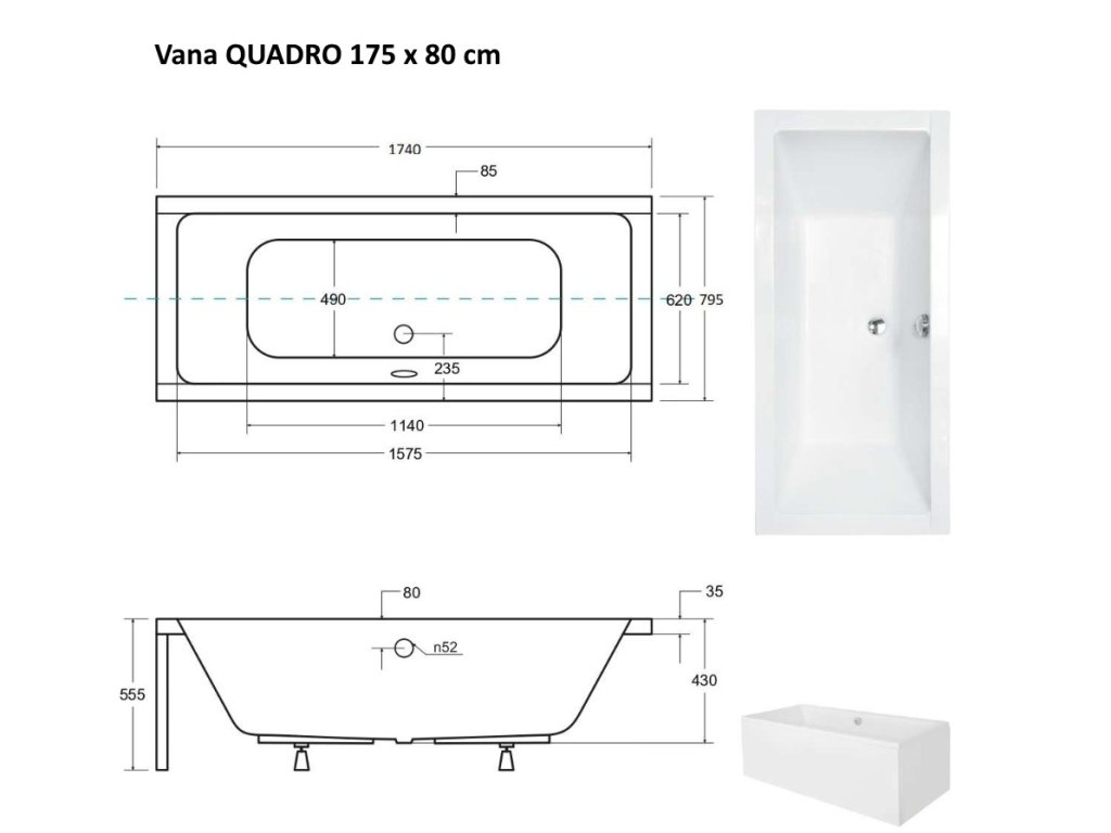 BESCO Obdélníková vana QUADRO Nožičky k vaně - S nožičkami, Rozměr vany - 175 × 80 cm VANQAUD175+OLVPINOZ