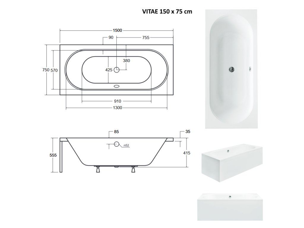 BESCO Obdélníková vana VITAE Nožičky k vaně - Bez nožiček, Rozměr vany - 150 × 75 cm VANVITAE150