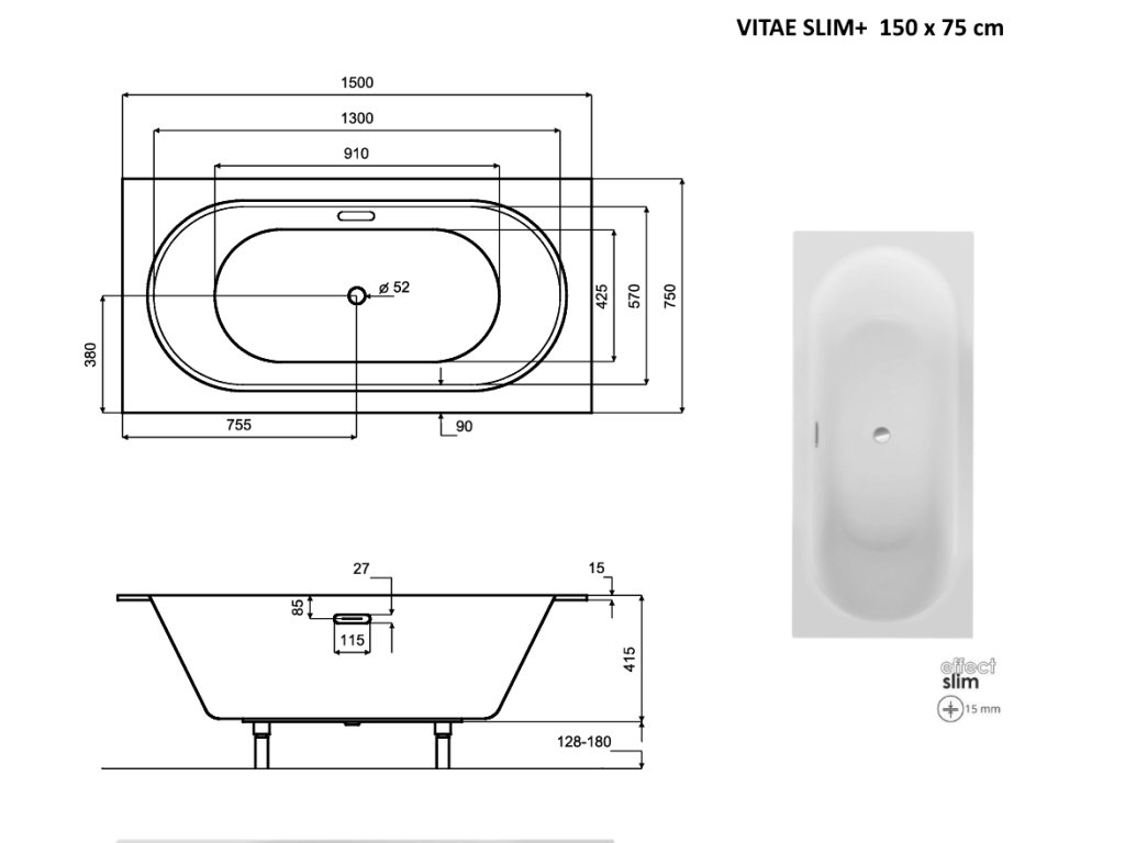 BESCO Obdélníková vana VITAE SLIM+ Barva sifonu - Zlatá, Nožičky k vaně - Bez nožiček, Rozměr vany - 150 × 75 cm VANVIT15SLIMPLZ