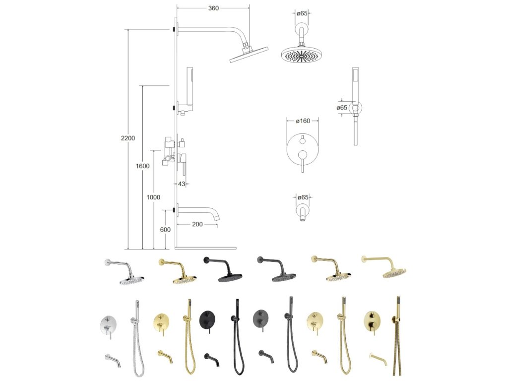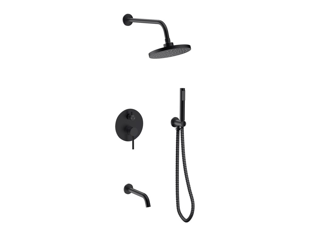 - Set obsahuje podomítkovou baterii, vývod ze stěny s držákem, včetně ruční sprchy a hadice, dále držák a kulatou hlavovou sprchu a stěnový vývod